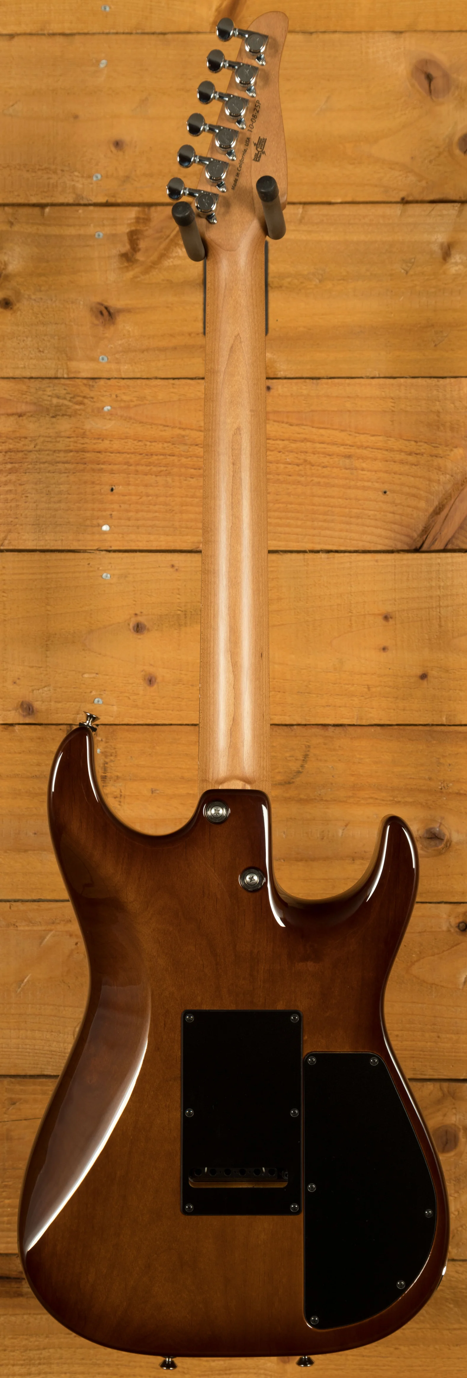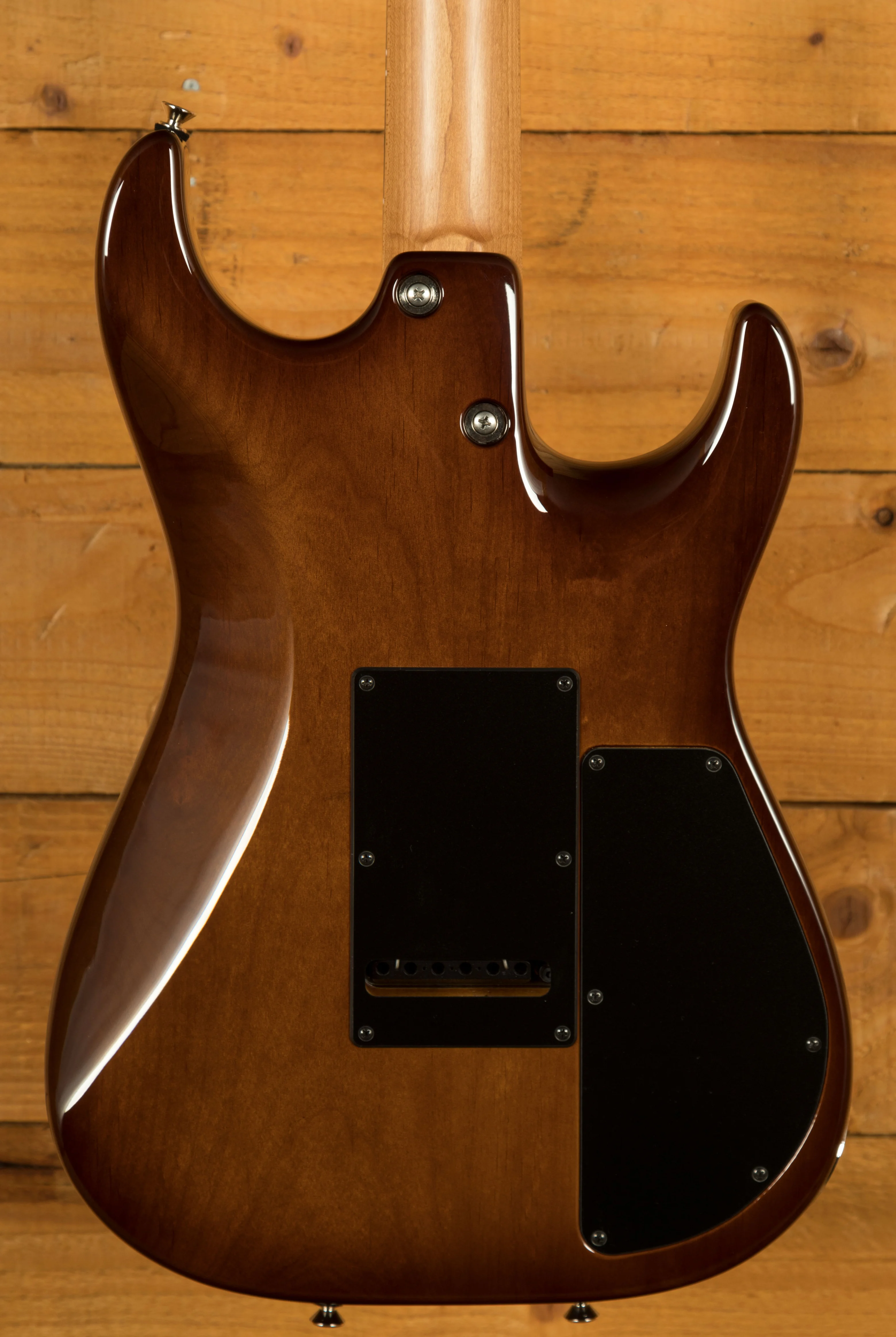 A truly stunning left-handed instrument, this Drop Top features the signature aesthetic of a gorgeous Flame Maple Top on Alder, finished in a high-gloss Tiger Eye Burst with binding. The sculpted "drop top" contour provides a smooth, comfortable surface for the picking arm.