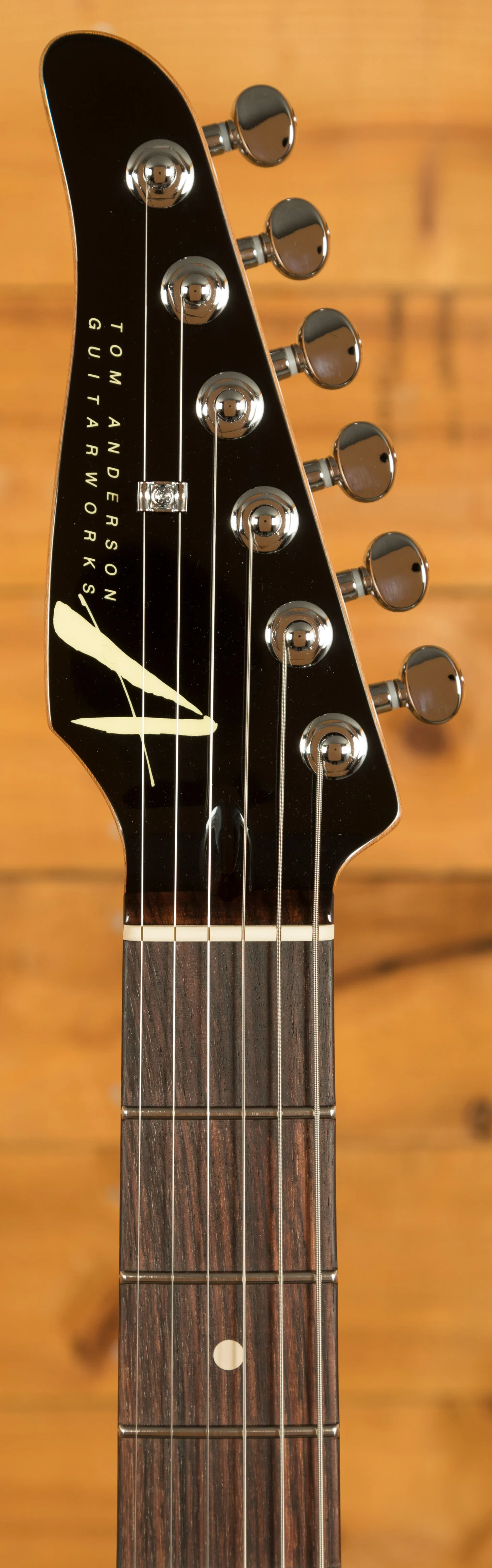 The neck is Caramel Maple with a Rosewood fingerboard and a black headstock, featuring the slightly deeper Even-Taper +.030 back shape for a substantial yet fast feel. The entire playing surface features Anderson’s acclaimed 12-to-14 inch conical radius and Jumbo Stainless Steel frets, guaranteeing "silky smooth string bends and liquid smooth vibrato."