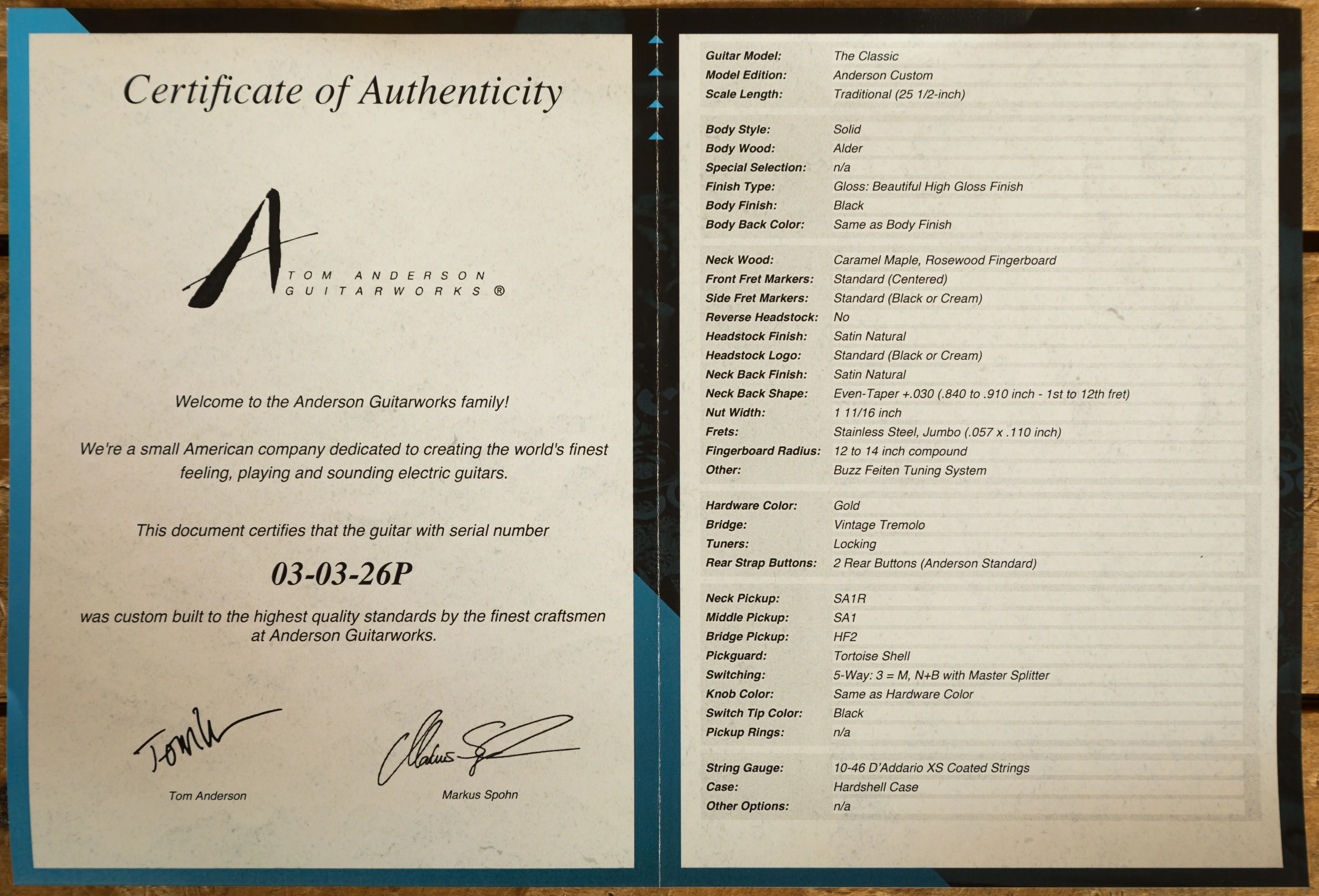 Completing the package are .010-.046 Elixir strings, which offer exceptional tone and extended lifespan. Additionally, all Anderson guitars come equipped with the Buzz Feiten Tuning System, ensuring precise intonation and accurate tuning across the fretboard.
