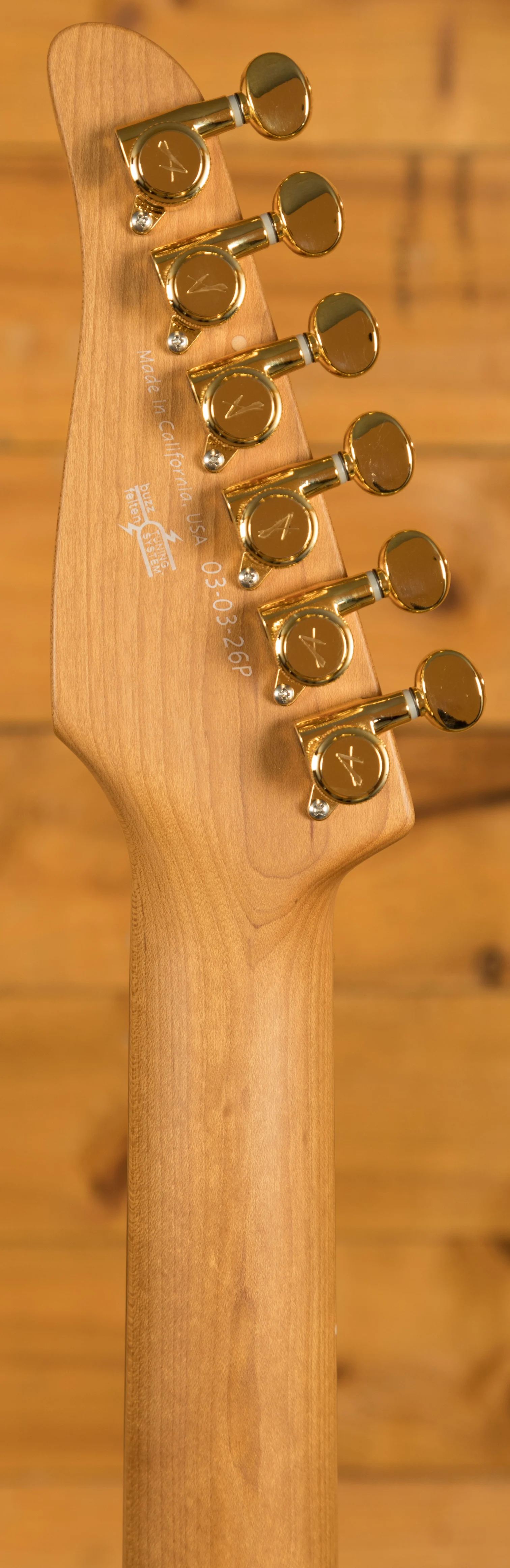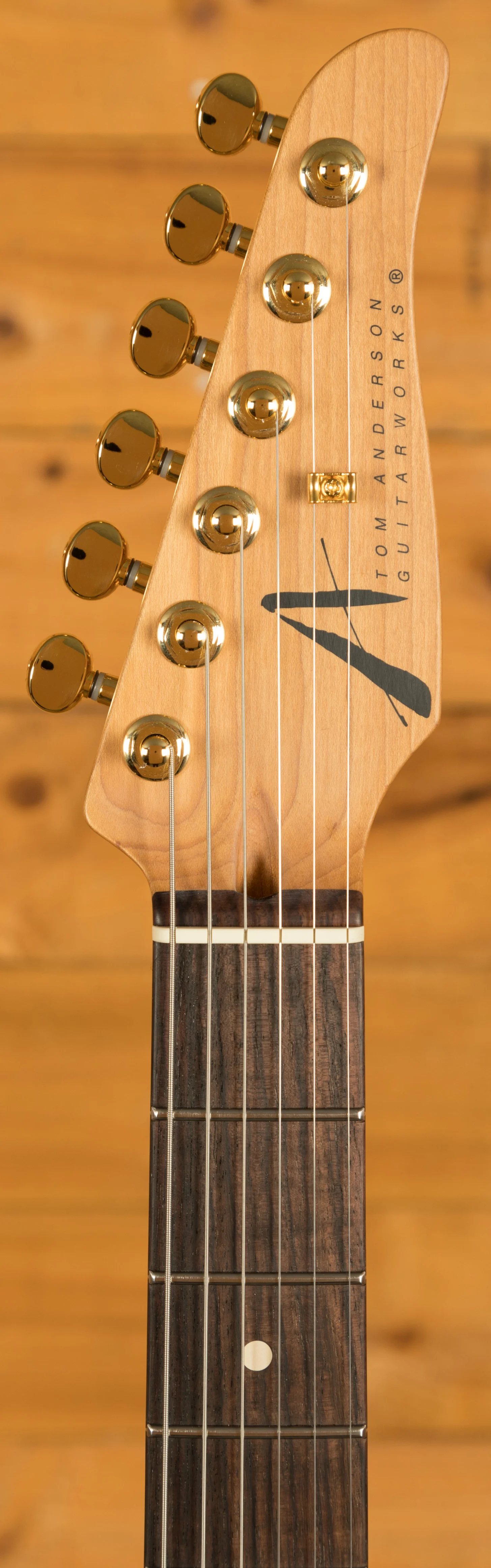 Rocking Tom Anderson SA1 single-coils and a HF2 humbucker pickup with a master splitter switch, you have tonnes of tonal options here, it has a really full bodied and fat, lush tone. With a vintage tremolo bridge and locking tuners, you get incredible tuning stability and intonation.