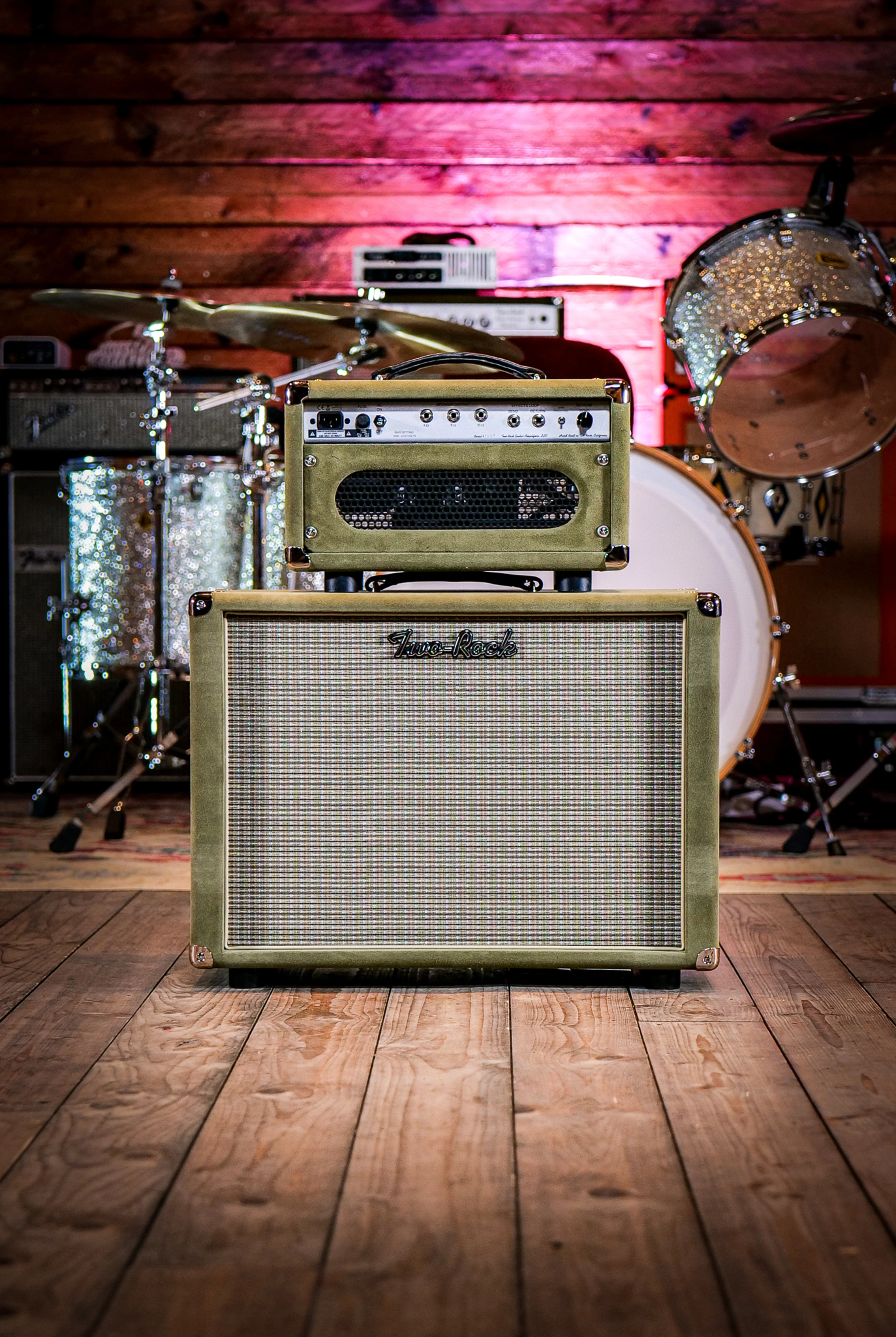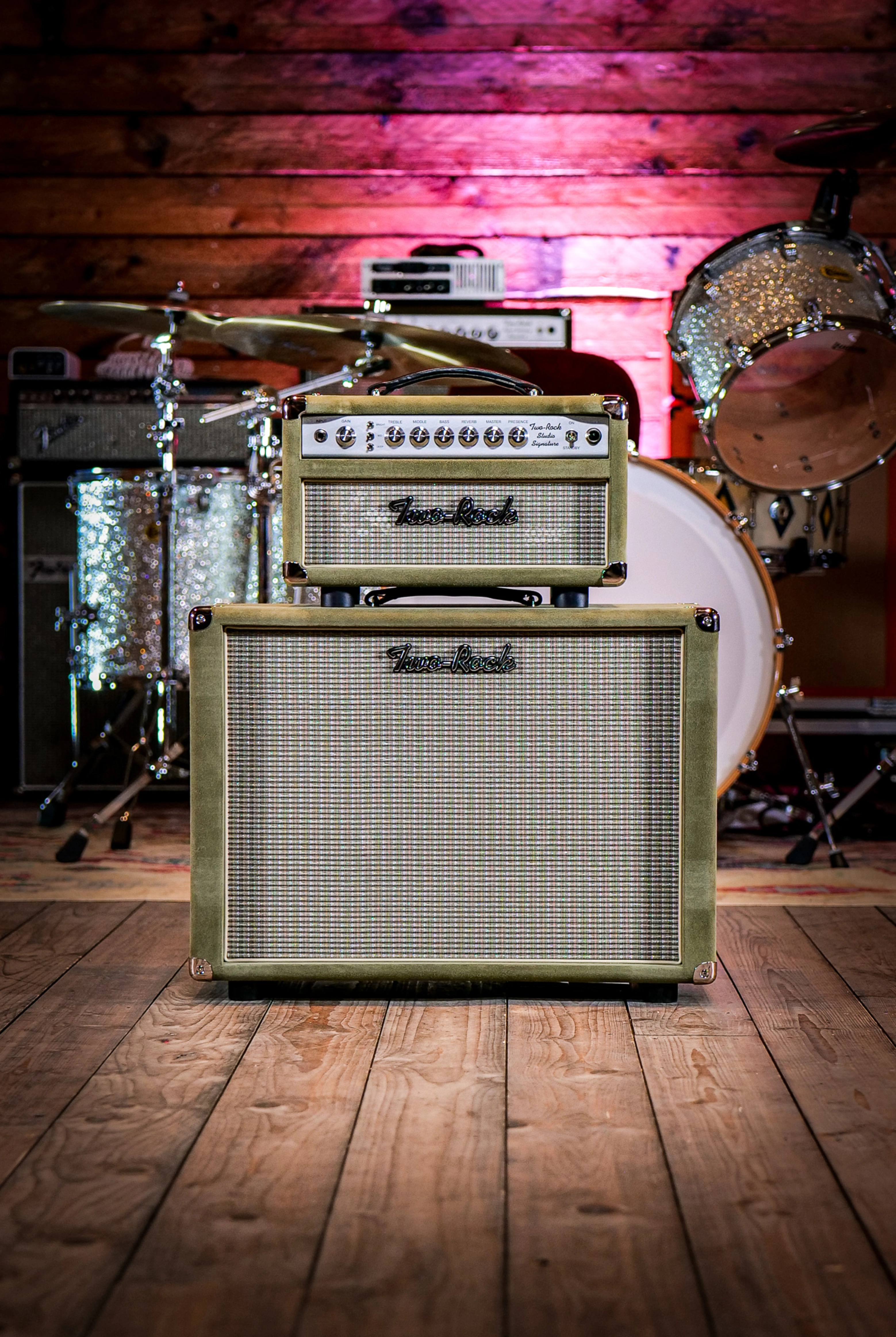 Finished in a custom Moss Green suede this amp certainly looks and sounds the part. Paired up with a TR 1265B loaded matching 1x12 cab