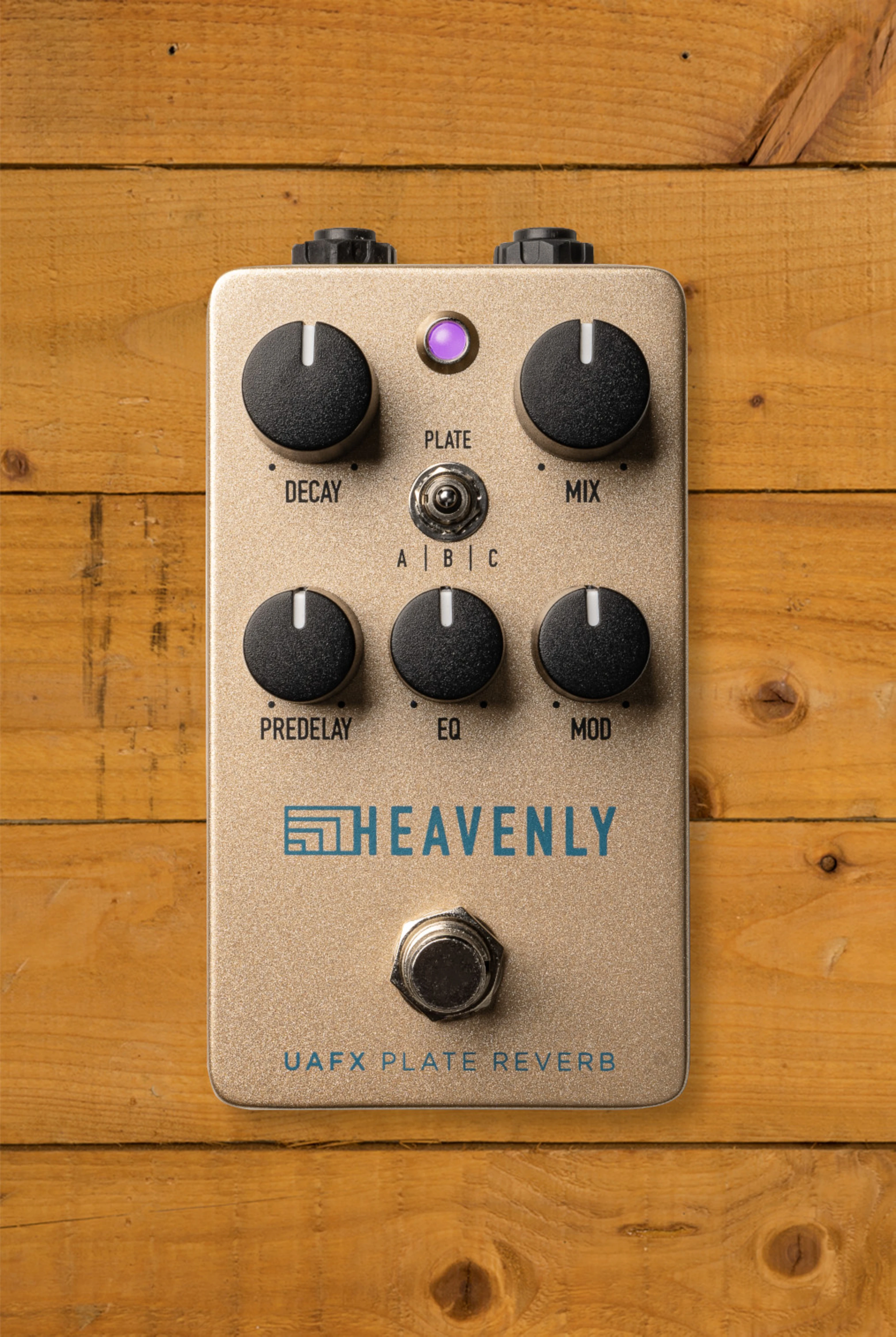 With true bypass and trails bypass options, the Heavenly Plate integrates seamlessly into modern pedalboard setups, ensuring natural decay when switching effects. Built with Universal Audio's renowned craftsmanship, this pedal is designed for years of rock-solid performance.