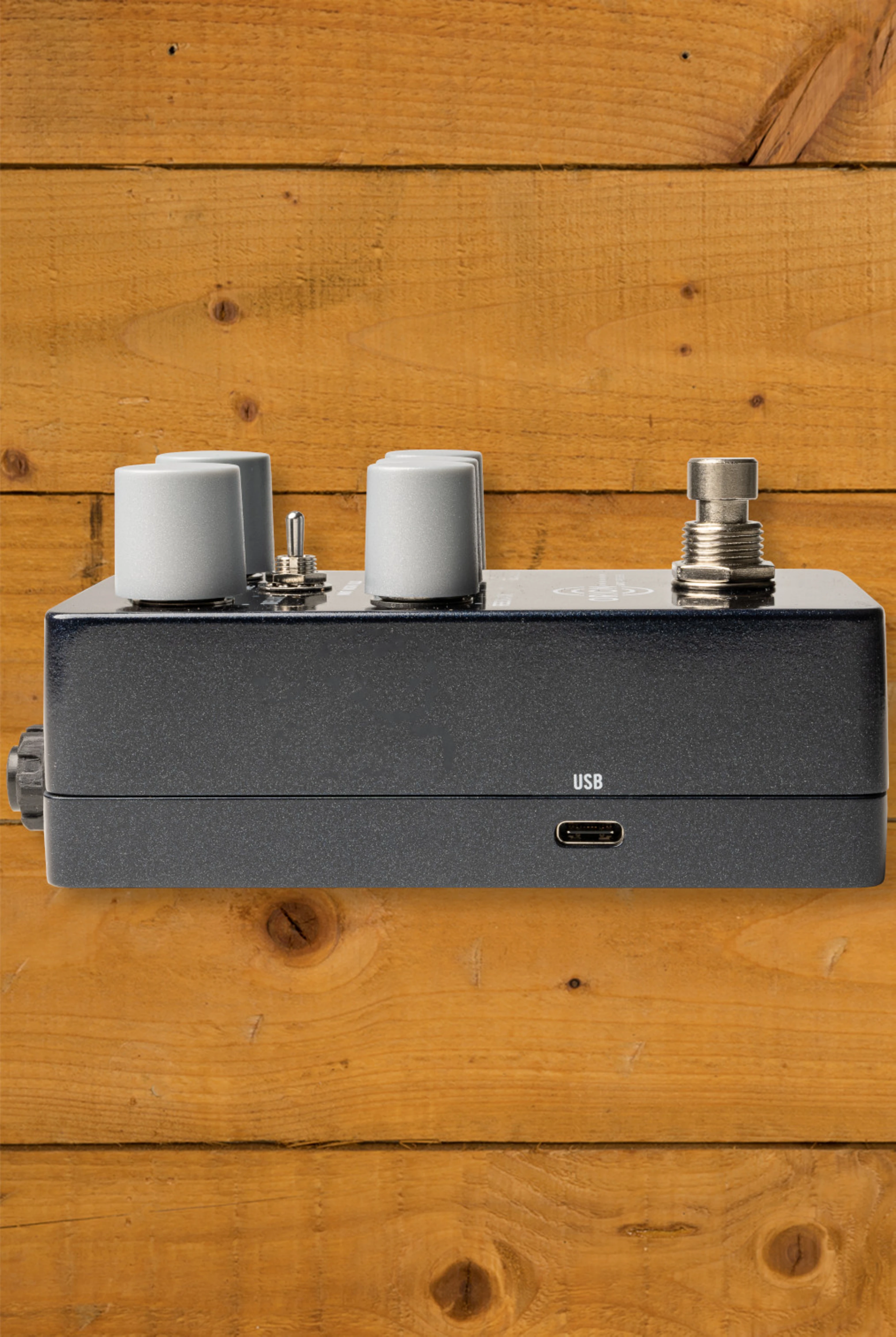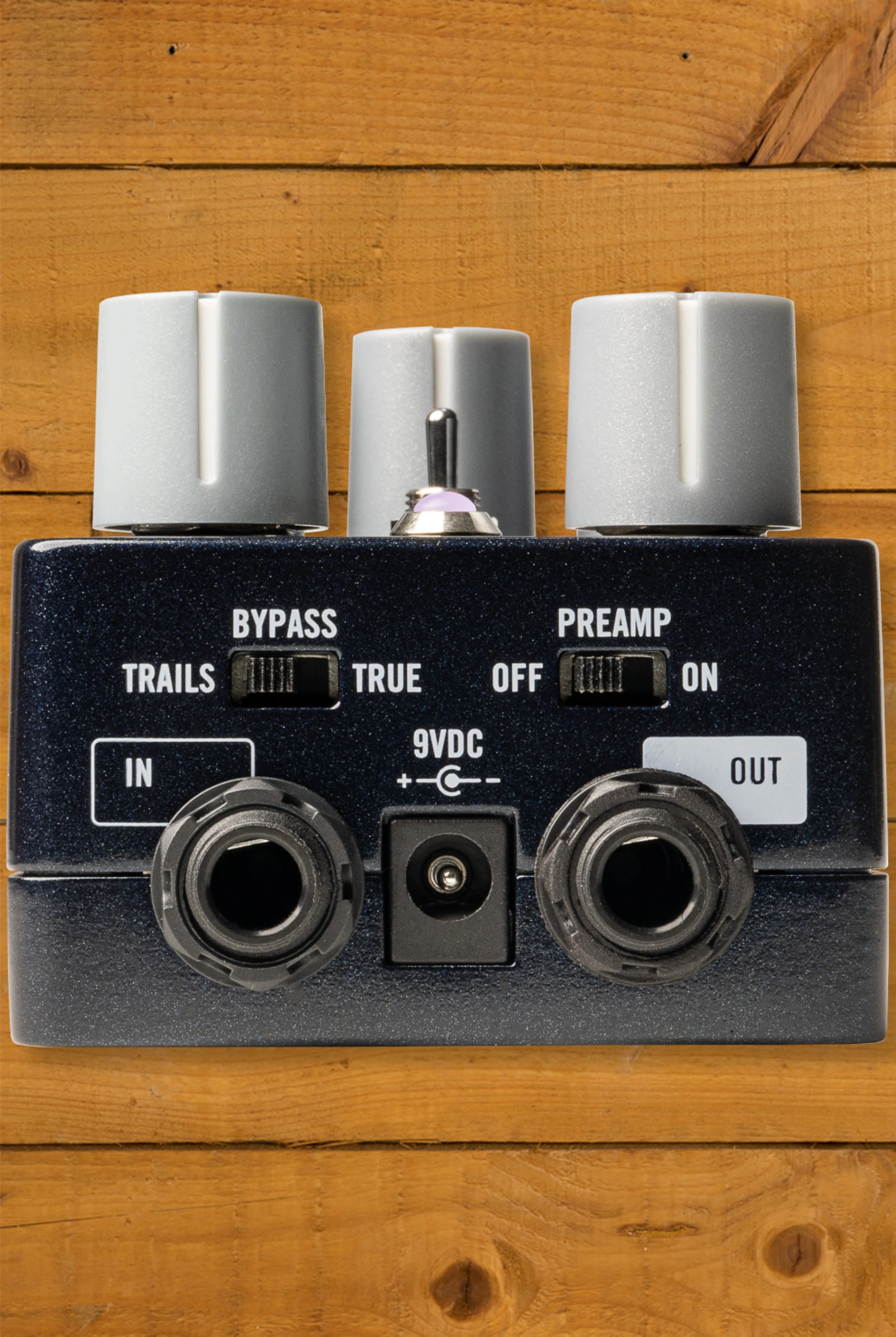 The pedal includes a faithfully emulated EP-III solid-state preamp, ensuring fat, boosted tones that enhance sustain and punch. Players can toggle between true bypass and trails bypass, preserving signal integrity while allowing for natural decay when switching effects.